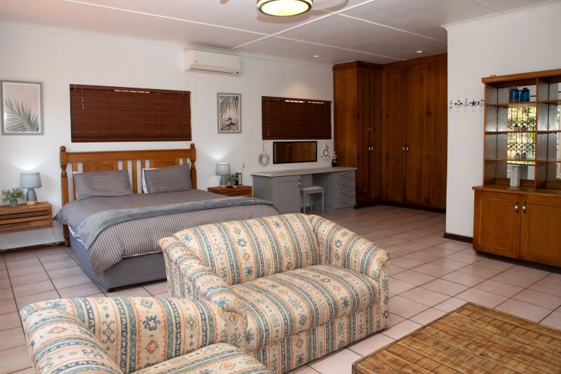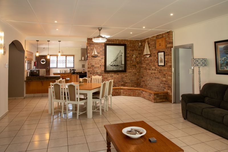 The open-plan living area features a lounge, a dining area and a kitchen. The kitchen is equipped with a gas stove, oven, microwave, air fryer, fridge-freezer, dishwasher, washing machine, tea- and coffee-making facilities and cutlery and crockery. The dining area is furnished with a dining table suitable for 8 guests. The lounge is furnished with a comfortable lounge suite, a coffee table, ceiling fans and a smart TV with a full DStv package and sound bar. Access to free Wi-Fi is available. The home is spared from loadsheading by a full solar system.