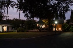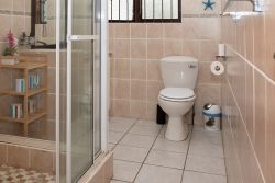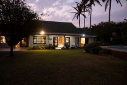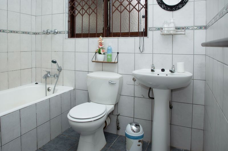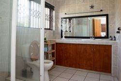 This lovely house can accommodate 10 guests and comprises 4 bedrooms and 3 bathrooms. The main bedroom is furnished with a king-size bed and features an lounge area with a smart TV, air-conditioner, ceiling fan, en-suite bathroom fitted with a shower, toilet and washbasin. The second and third bedrooms are each furnished with a queen-size beds and ceiling fans. The last bedroom is furnished with 2 bunk beds and ceiling fan. The second bathroom is fitted with a shower while the fourth bathroom has a shower-over-bath. Quality linen is provided; however, guests are required to bring their own bath and swimming towels.