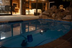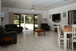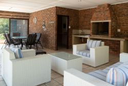The living area opens up onto a covered verandah, which boasts stunning views of the garden and swimming pool area. The pool room features a comfy lounge suite ideal for relaxing with shower and toilet facilities. Guests can enjoy a dip in the sparkling swimming pool, a picnic in the garden or simply socialise around either the indoor braai or outdoor fire pit. Access to secure parking is available.