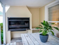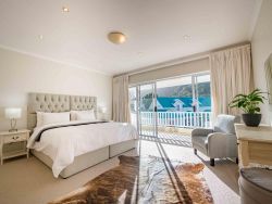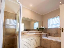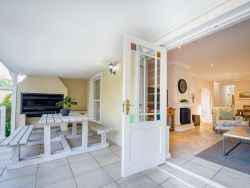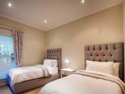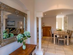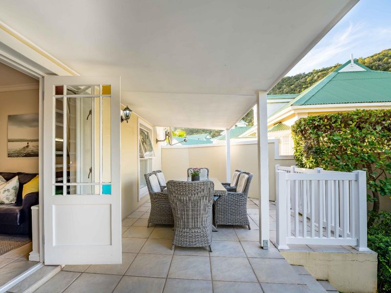 Centrally located in one of Plettenberg Bay’s most sought-after estates, the elegant River Club 4262 is within walking distance of Central Beach, restaurants and the Beacon Isle Shopping Centre, and approximately 7 km from Goose Valley Golf Estate and other golf courses. Lush furnishings and earthy colours create a beautiful, inviting space with personal and family heirloom touches. Each of the four comfortably furnished bedrooms has an en-suite bathroom and 2 sets of linen, towels and one set of beach towels are provided for each room. Three of the rooms are furnished with comfortable queen-size beds and the fourth contains 2 single beds. One of the bathrooms is fitted with a shower and a bath, while the others have showers only. Two of the rooms are located on the ground floor and the main bedroom is a stunning large private space on the top floor offering mountain views from a north-facing balcony. The fourth bedroom is a striking sunlit studio with doors leading to the outside and its own coffee nook, and an interior door connects it to the rest of the house. The ground floor comprises an open-plan lounge, dining room and fully equipped kitchen. The kitchen has a fridge, freezer, gas hob, electric oven, microwave, laundry and scullery with a washing machine, tumble dryer, ironing facilities and a dishwasher. From here a door leads out to an exterior sink. The lounge has a TV, media box, relaxing couch, and log-burning fireplace, leading through double doors onto a covered patio with a built-in braai, outside dining table and picnic bench. A well-kept private garden leads off the patio, which is a short boardwalk away from a beautiful river. Here mountain views bring a true sense of the historic forest Tsitsikamma to your stay and you can walk to your heart's content viewing birds and wildlife along the banks. Please note the lawn is not fenced in. To accommodate loadshedding, the River Club 4262 is equipped with an inverter which keeps the TV and Wi-Fi switched on, and rechargeable lights and emergency lights in the main areas are provided. The double garage with automated doors is connected to the house. The River Club estate offers 24-hour security, a large swimming pool, a kids' play area, and tennis and squash courts. Mountain views, riverbank walks, birdlife and serenity are on your doorstep.
