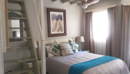 The Chalets are open plan apartments with a small, fully equipped kitchenette, and en-suite bathroom with both bath and shower. There is a deck above the main bed with two more single beds accessible via a ladder which is ideal for a family with children.