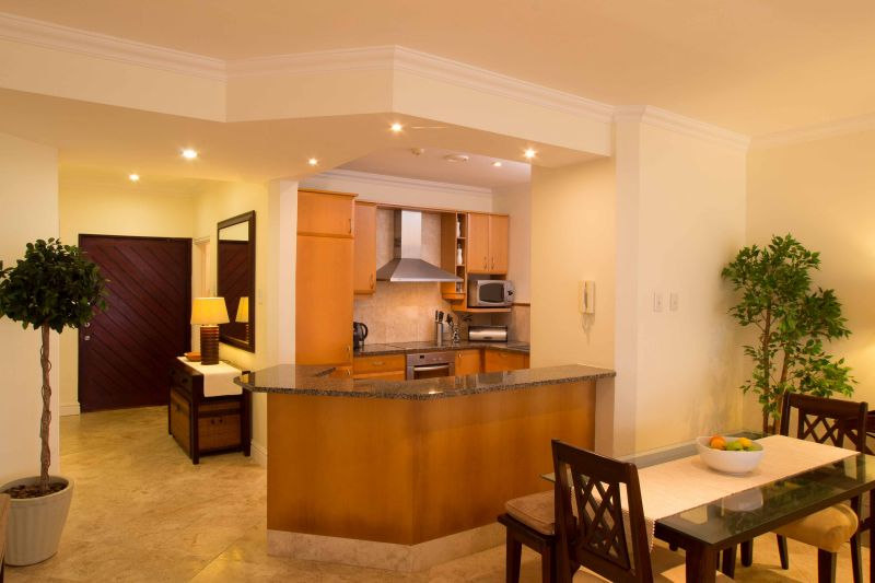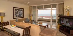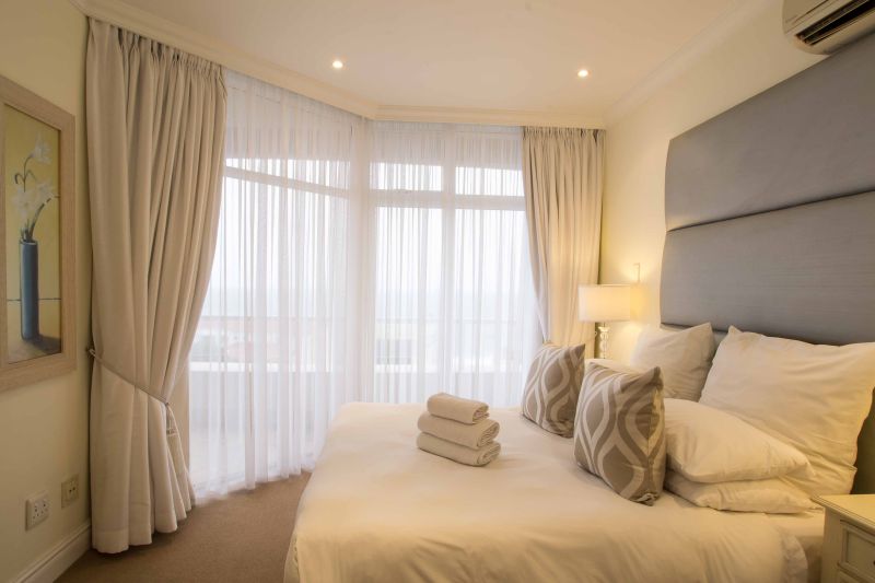 This luxury self-catering apartment consists of a lounge, a dining area and a fully fitted modern kitchen. There are two double bedrooms, each with their own en-suite bathroom. The apartment can comfortably sleep four guests with a Queen-size bed in the main bedroom and twin beds in the second bedroom. Quality linen and bath towels are provided. Off the lounge are sliding doors onto the patio with views of the sea. The apartment is serviced daily except on Sundays and public holidays. Secure double undercover parking is available.