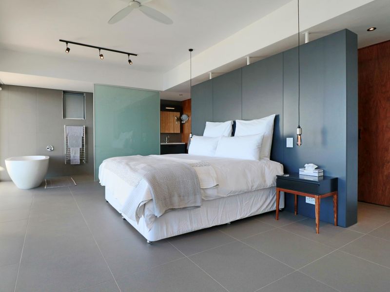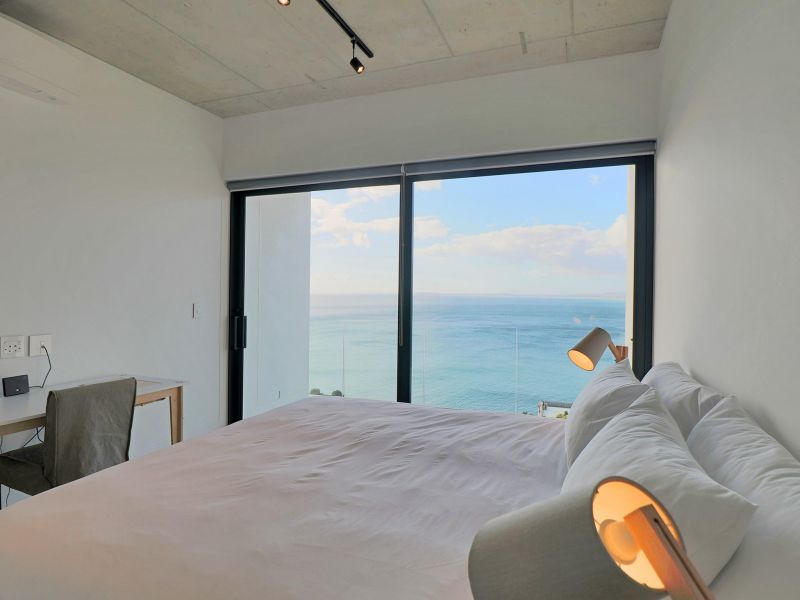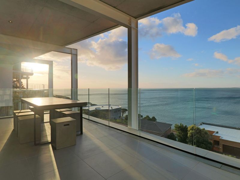 Located on Gordon’s Bay Mountainside, this stunning architect-designed property offers spectacular views of False Bay, Table Mountain and the Helderberg mountain range. The house has been luxuriously furnished and equipped in a contemporary open plan style with high ceilings, large living areas and floor-to-ceiling sliding glass doors that provide stupendous panoramic views from every room. Entering from the front door or garage to the upper level of the house, you find two master bedrooms and two guest bedrooms, each with en-suite bathroom and private balcony. The master bedrooms have a bath and shower in the open plan area allowing you to admire the view as you bathe. They also have TVs. One of the guest rooms has its own kitchenette area, making it self-contained. Descending the stairs, you find the large open plan kitchen, dining room and lounge areas. The beautiful custom-made brass-topped dining table seats twelve people. The lounge offers a gorgeous, soft, sectional sofa facing a 60 inch television above a double-sided wood burning fireplace. The kitchen is fully-equipped and offers an induction hob and four ovens – giving a huge range of cooking options. Outside there is a covered balcony with braai/barbeque, again overlooking the sea, as well as a quiet shaded courtyard to the rear. The scullery/laundry behind the kitchen contains fridge-freezer and facilities for washing and drying dishes and clothes. On this floor there are two more bedrooms, each with a private balcony. One bedroom has an en-suite bathroom and the other bedroom shares the bathroom next to it with the main living area.
