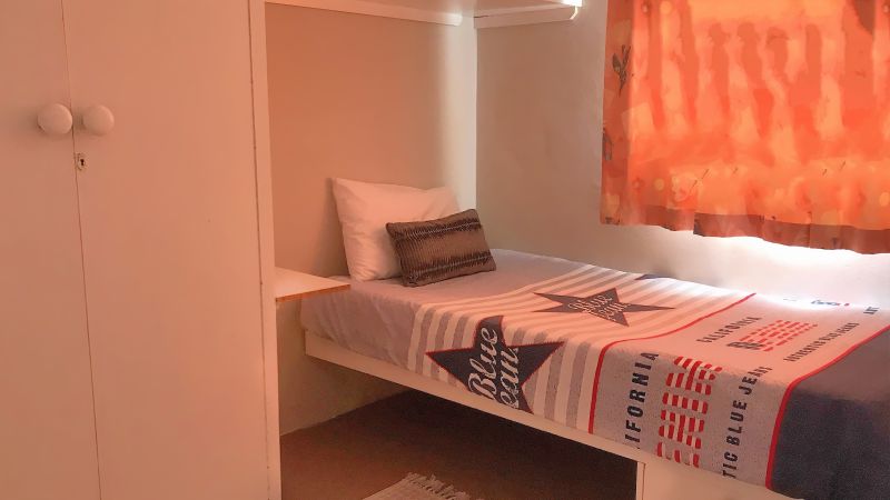 A spacious queen room with adjoining room with extra single bed and a built-in cupboard for ample clothes storage. The room has an extra wide+long queen size bed, full size fridge-freezer, TV & free wifi with a backyard view. The separate bath, shower and toilet is shared between rooms 2 & 3.