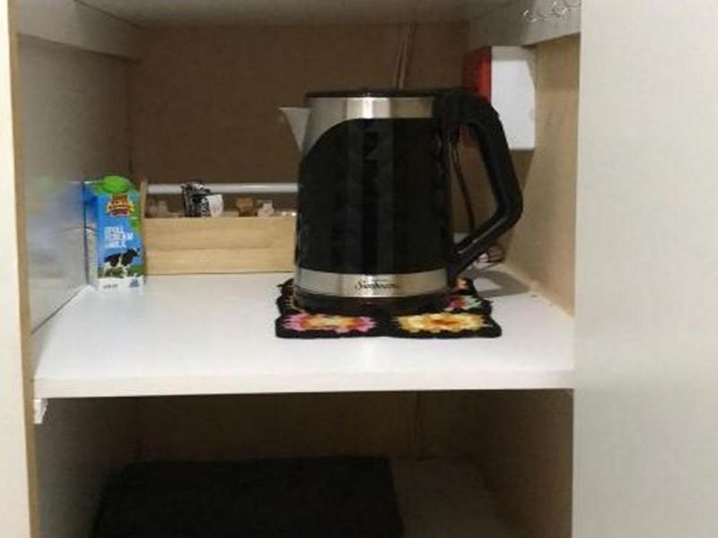 A spacious queen room with small lounge area and plenty build-in cupboards suitable for long-stay couples. The room has an extra wide+long queen size bed, full size fridge-freezer, TV & free wifi with a backyard view. The separate shower and toilet is shared between rooms 2 & 3.
