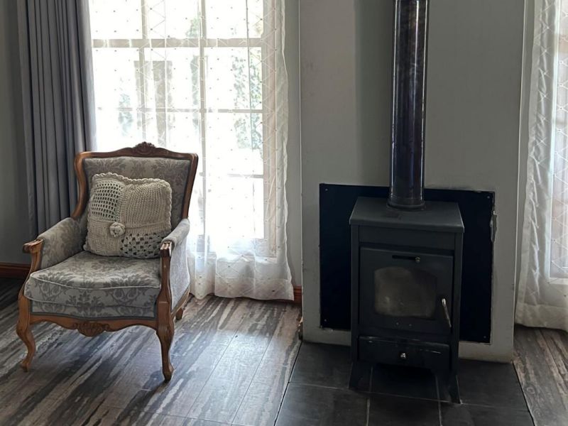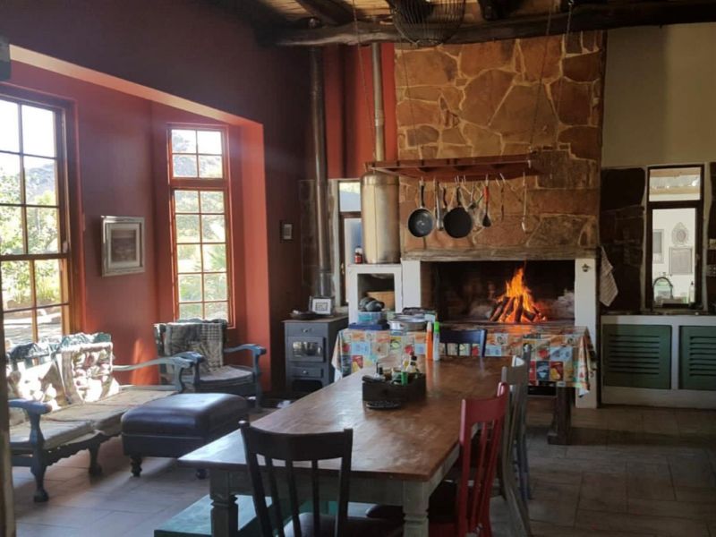 The Manor House, a stunning work of art nestled within the Witteberg mountain range, operates completely off-grid with its own borehole water and solar power. Inside, the two main bedrooms each feature a wood-burning stove for warmth during the colder months. A third bedroom is located on the second floor, next to a study with a fireplace and a private balcony overlooking the garden. For families, there is a dedicated family room with two adjacent bedrooms, each with its own en-suite bathroom. The house also boasts a fully equipped communal kitchen, an informal dining area with an indoor braai, and a more formal dining and lounge space. Outside, a veranda offers an additional braai, lounge, dining area, a sunroom, and a swimming pool. A baby cot is also available upon request.